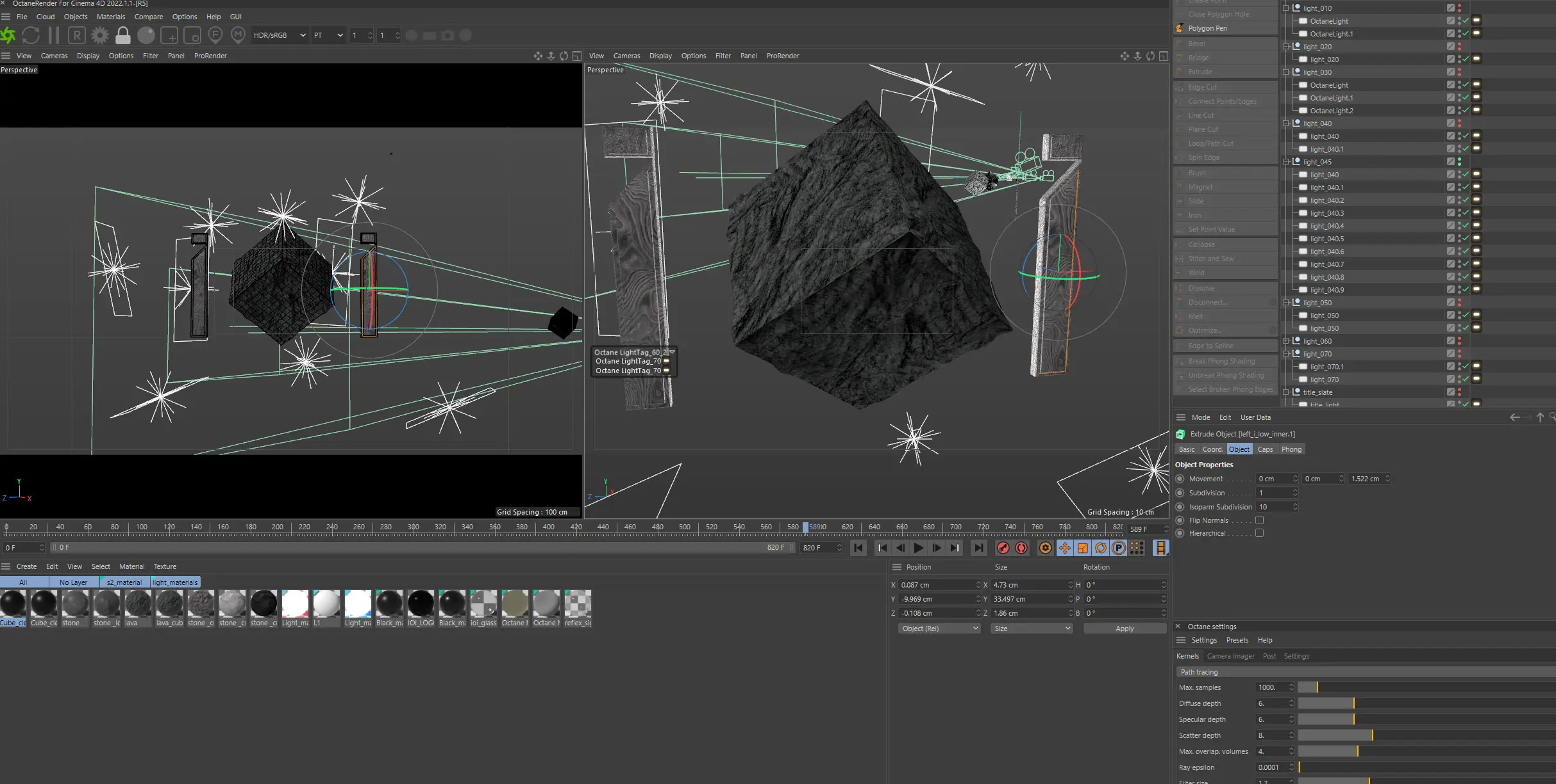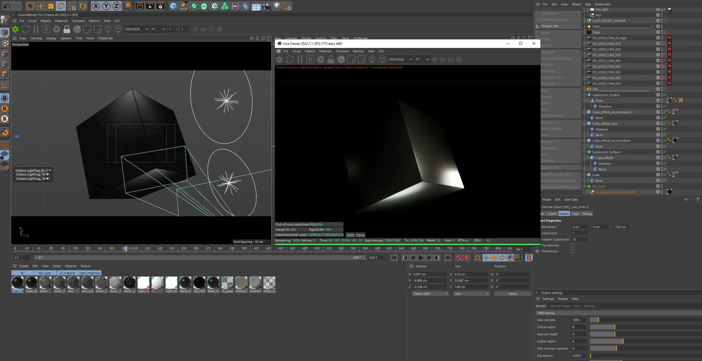 The first step was to block out a rough 3D scene to get the pacing and some general camera ideas in place. Then I went on to texturing the cube and and add animated lights to the scene. Once I was satisfied with the pacing and visual quality, I sent it over to the audio.
